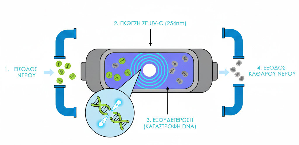 Καταστροφή DNA: Η ακτινοβολία διεισδύει στα κύτταρα των βακτηρίων, των ιών και των άλγεων, καταστρέφοντας το DNA τους. Αυτό τους εμποδίζει να αναπαραχθούν, καθιστώντας τους αβλαβείς.